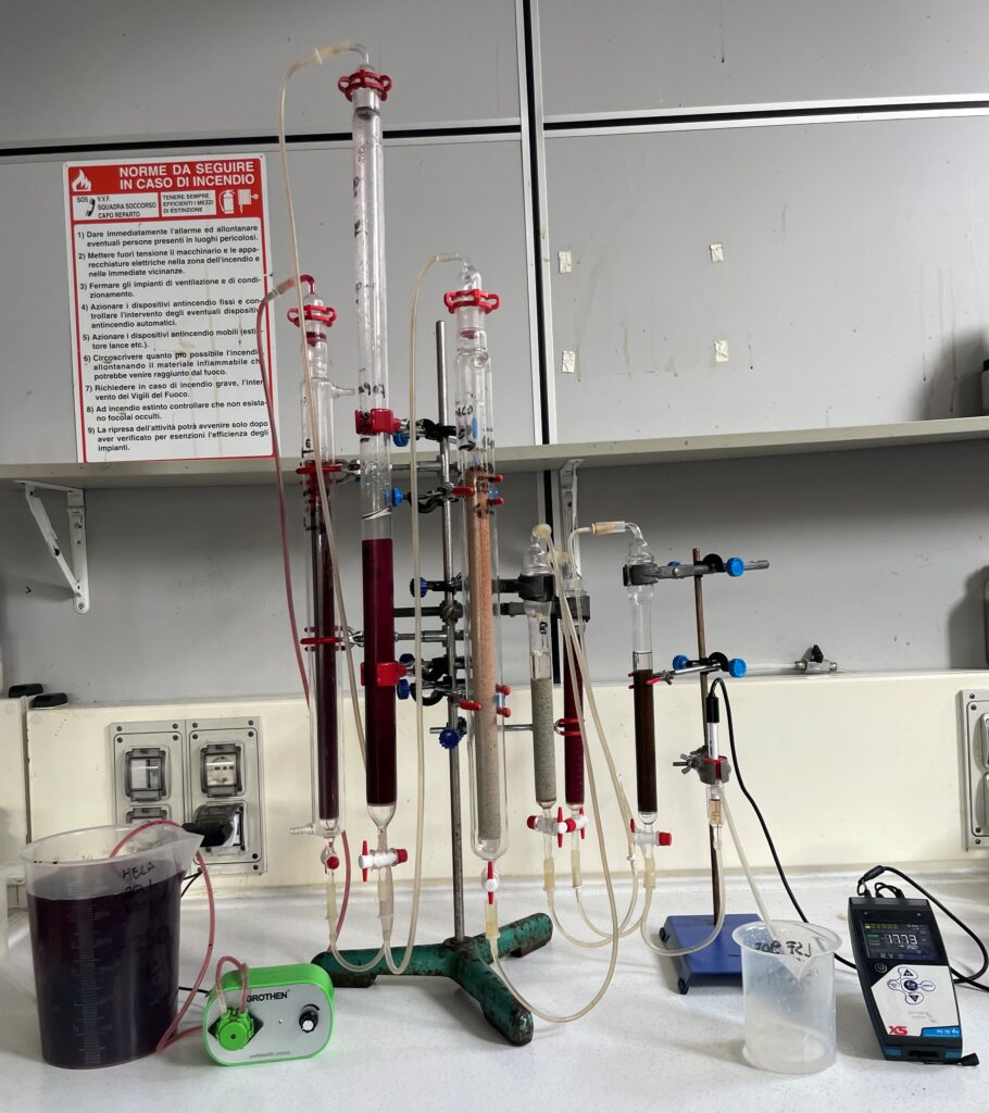 • Qualitative and quantitative tests with pilot plant with 3/5 liter resin columns aimed at defining the cycle length, regenerative efficiency, consumption of reactants for regeneration, eluate volumes and consequent sustainability.